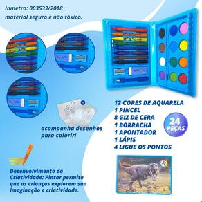 Especificações técnicas: - 2 maletas de pintura infantil - 6 giz de cera - 12 cores de aquarela - 4 jogos de ligar os pontos - Apontador - Borracha - Pincel - Lápis