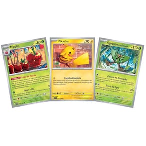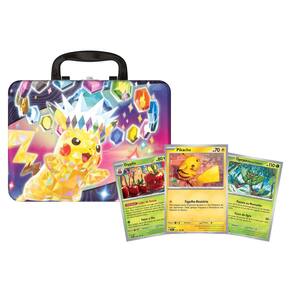 3 Cartas holográficas de Pikachu, Dipplin e Ogerpon Máscara Turquersa! 8 pacotes de booster do Pokémon Estampas Ilustradas! 1 Maleta em metal para guardar tudo! 1 carta codificada para o Pokémon Estampas Ilustradas Live.
