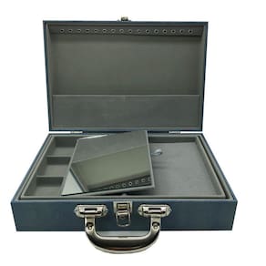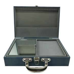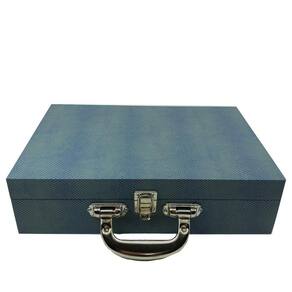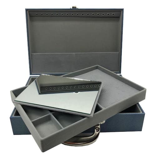 Maleta Porta-Joias Azul Jeans Grande-Dupla, material externo em couro sintético e material interno e das almofadas em veludo cinza. Feixo em metal.
