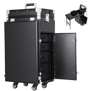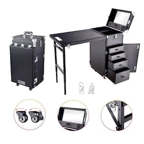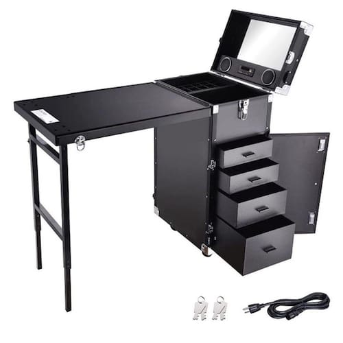 - Trabalho portátil de maquiagem de manicure 83,8 x 40,6 x 78,7 cm com organizador de esmalte, 4 gavetas, uma mesa de chão expansível. Além disso, a tampa cobre o espelho, alto-falante de rádio e porta USB.