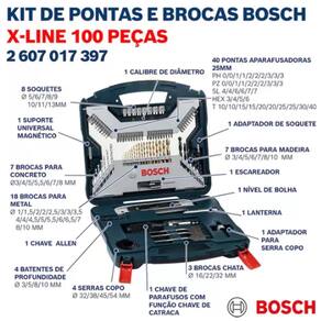 O Kit de Pontas e Brocas em Titânio X-Line Bosch é um produto completo e ideal para quem busca praticidade para executar diferentes tipos de trabalho.Hobbistas, pequenos reparos, encanadores, eletricistas, construção civil, instaladores, pequenos trabalhos em marcenaria e serralheria.Inclui uma variedade de pontas e brocas, além de diversos acessórios que auxiliam em aplicações de parafusamento, perfuração e fixação.O design das Pontas foi desenvolvido para evitar o desgaste da cabeça dos parafusos trazendo maior firmeza durante as aplicações, e possuem o encaixe em formato hexagonal que evita o deslizamento na ferramenta.São acompanhadas também por um suporte universal magnético que possibilita trocas rápidas e a fixação segura das pontas.Os revestimentos de Titânio nas Brocas de Aço Rápido e nas Brocas Planas proporcionam maior velocidade e durabilidade durante as aplicações.Com sua ampla variedade de acessórios, o Kit pode ser utilizado em diversas aplicações desde reparos, instalações e montagens, até pequenos trabalhos em obras, serralherias e marcenarias, além de acompanhar uma maleta robusta que facilita a armazenagem, transporte e acesso de todo o conteúdo de forma bastante organizada.O design das Pontas foi desenvolvido para evitar o desgaste da cabeça dos parafusos trazendo maior firmeza durante as aplicações, e possuem o encaixe em formato hexagonal que evita o deslizamento na ferramenta.