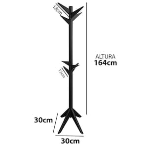 Altura: 164 cm Largura: 30 cm Profundidade: 30 cm Peso: 2 kg Cor: laca preto; Material: madeira maciça; Itens inclusos: 01 cabideiro reticulado, kit de montagem, manual de montagem.