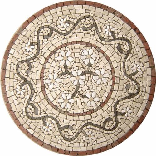 O Rosone Floral é um clássico de origem no Mosaico Romano. Há mais de 10 anos, ele tem sido um dos modelos mais pedidos em nosso ateliê, devido à sua estilização elegante da margarida, composta por 6 tesselas de pedra branca.