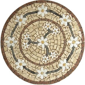 O Rosone Floral é um clássico de origem no Mosaico Romano. Há mais de 10 anos, ele tem sido um dos modelos mais pedidos em nosso ateliê, devido à sua estilização elegante da margarida, composta por 6 tesselas de pedra branca.