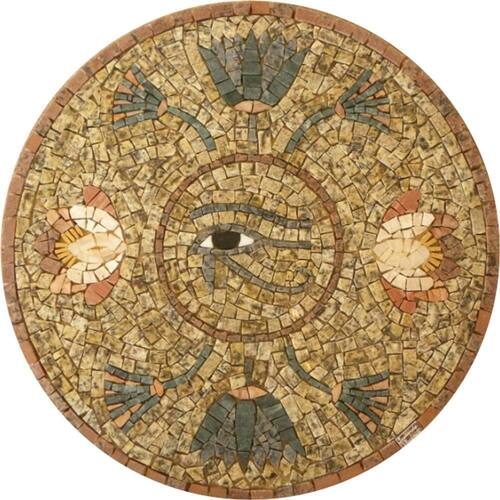 O design da mandala é influenciado pela estética egípcia, com curvas elegantes e cores que remetem à terra e à vida vegetal. O fundo em granito amarelo ornamental confere um toque dourado reminiscente do medalhão do sol egípcio.