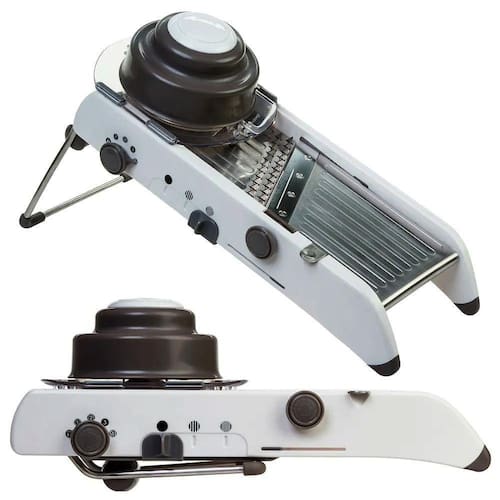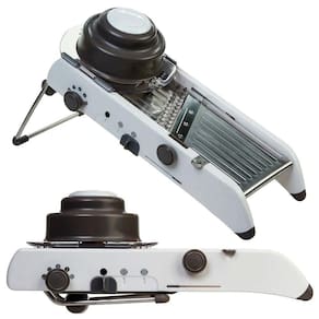 Possui espessura ajustável, de 1 mm a 7,5 milímetros, e o julienne pode ser definido como grosso ou fino. O protetor de mão incluído apresenta dentes longos para fixar nos alimentos e oferecer total segurança. Os pés anti-derrapantes e punho elevado lhe permite cortar diretamente sobre tigelas e bowls.
