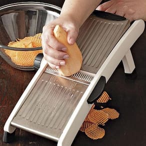 O Mandoline Fatiador Profissional tem um sistema totalmente integrado de corte, sem peças soltas, sendo seguro e fácil de operar. Seu design simples, construído com lâminas ajustáveis pelo simples giro de um botão, torna rápido a troca de corte, desde julienne a cortes de waffle (também conhecido aqui no Brasil como corte Prussiana).