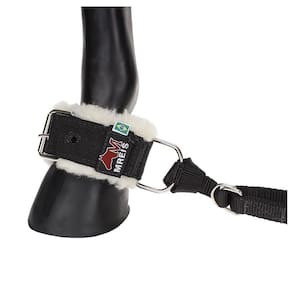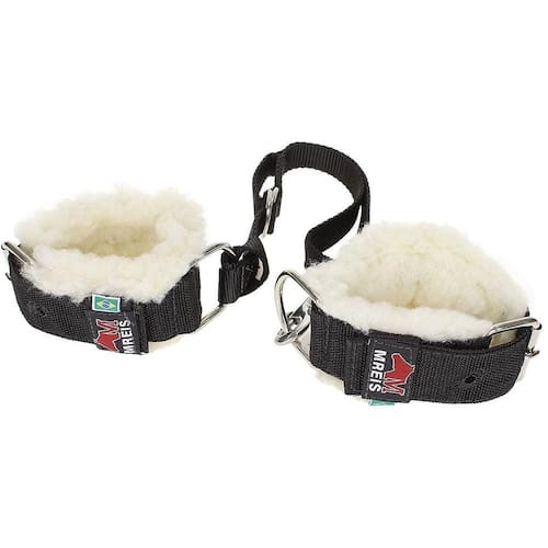 Maneia importada fabricada em fita de nylon reforçado com interior em pelúcia, possui argolas em metal com banho de cromo e regulagens para fixação. Ferramenta utilizada para manter o animal nas proximidades quando estiver solto, pois limita seus movimentos ao tentar galopar.