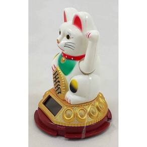Item para decoração de um gato japonês da sorte feita em plástico Com funcionamento da pata através de luz solar.