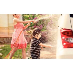 - Mangueira com alta flexibilidade e fácil manuseio. - Possui 30 metros de comprimento. - Recomendada para situações de uso com pressão da água de até 12 bar [174 psi] e temperatura de 50 C. - Para maior resistência possui 3 camadas distintas: interna em PVC, intermediária em fio de poliéster trançado e externa em PVC. - Acompanha 01 esguicho com jato regulável, 02 engates rápidos e 01 adaptador fêmea com rosca de 3/4 e redução de 1/2. - O esguicho possui prático sistema de regulagem do fluxo d'água através do regulador frontal. - O esguicho é conectado em mangueiras de 1/2, 5/8 e 3/4 através de sistema de engate rápido.