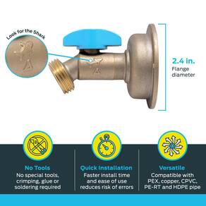 - MANGUEIRA DE 45 GRAUS SHARKBITE BIBB: válvula de fechamento de um quarto de volta com flange e entrada de montagem pode ser usada para regular o fluxo de água; combina uma saída de mangueira de jardim de 3/4 polegadas com 1/2 polegada entrada de pressão para conectar em um ângulo de 45 graus para evitar dobras na mangueira - VERSÁTIL: mangueiras de latão funcionam bem com tubos PEX, CPVC, PE-RT, SDR-9 HDPE e cobre; o babador possui um suporte patenteado de peça única de 2,4 polegadas de diâmetro