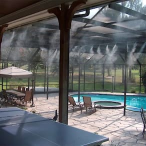 Kit Sistema de Climatização e resfriamento ideal para quintais, varandas, barracas gazebos e locais abafados que necessitam de diminuição na temperatura. A mangueira Possui 10 metros com 10 bicos pulverizadores que distribuem a névoa de água uniformemente pelo espaço, o kit vem com conector para torneiras e com braçadeiras para prender a mangueira em locais suspensos ou verticais.