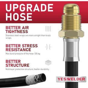 Acessórios de gás inerte YESWELDER 5/"8 UNF-18RH - Comprimento da mangueira: 250 cm/2,5 m - Conexões UNF-18RH de 5/"8 - Pressão de funcionamento de 200PSI - Pressão de explosão de 800PSI - Mangueira de borracha premium, extremidades crimpadas - Compatível com argônio, CO2, hélio e qualquer outro gás de soldagem