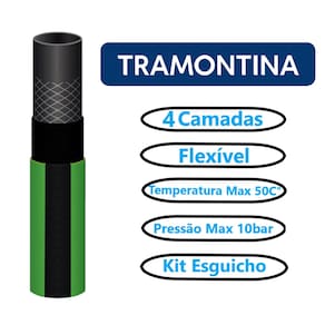 Informações Gerais - Acompanha kit esguicho - Mangueira flexível e de fácil manuseio. - Possui 30 metros de comprimento. - Recomendada para situações de uso com pressão da água de até 10 bar [145 psi] e temperatura de 50 °C. - Para maior resistência possui 4 camadas distintas: interna em PVC, intermediária em fio de poliéster trançado e duas camadas externas em PVC.