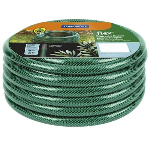 Para cuidar do seu jardim, você precisa de acessórios que sejam práticos e resistentes para desempenhar o trabalho com mais facilidade. A mangueira flex Tramontina verde em PVC 3 camadas 10 m é produzida com material de alta flexibilidade e revestida por três camadas, sendo que a camada em poliéster evita que a mangueira torça. Por ser flexível, o produto possibilitará atingir os pontos mais difíceis na hora de irrigar o seu jardim ou sua horta.