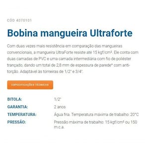 Mangueira que utilizamos nessa montagem é a Vicqua Ultra Forte, resiste até 15 kg por centimetro quadrado. Ela tem duas camadas de PVC e uma trama de poliester como camada intermediaria, para dar maior resistencia. A parede da mangueira tem 2,8 mm de espesssura, com anti torção.