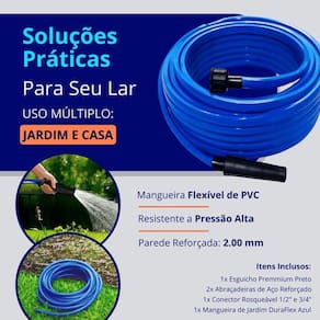 Diga adeus às mangueiras comuns que dobram, racham e estouram Nossa linha de mangueiras DuraFlex foi desenvolvida com materiais de alta qualidade, garantindo flexibilidade e facilidade de transporte. Com uma estrutura reforçada, as mangueiras DuraFlex são extremamente resistentes e não dobram, proporcionando uma passagem de água suave e contínua. Você pode confiar na DuraFlex para enfrentar os desafios diários de irrigação e jardinagem. Nossas mangueiras são altamente duráveis e resistentes, garantimos um desempenho consistente ao longo do tempo. Compatíveis com torneiras padrão de 1/2 e 3/4, as mangueiras DuraFlex se adaptam facilmente ao seu sistema de irrigação. Destacamos algumas características e diferenciais impressionantes das mangueiras DuraFlex: - Resistência excepcional: Nossas mangueiras são mais fortes e resistentes do que as mangueiras convencionais, garantindo uma vida útil prolongada; - Flexibilidade sem comprometer a passagem de água: As mangueiras DuraFlex permitem curvas suaves, facilitando o direcionamento da água exatamente onde você precisa; - Leveza e fácil caminhada: Projetadas para serem leves, as mangueiras DuraFlex são fáceis de transportar e usar, proporcionando uma experiência de uso agradável em seu jardim; - Acompanha kit de irrigação premium: Além da mangueira de excelente qualidade, o pacote também acompanha um kit de irrigação premium, já chegando pronta para uso. ESPECIFICAÇÕES: Modelo: DuraFlex; Material: PVC Siliconado de Dupla Camada; Pressão de Trabalho Recomendada: 12 bar 174 psi ; Temperatura de Trabalho Recomendada: 5C a 50C; Medidas Internas: 1/2 x 2,00 mm; Comprimento: 30 Metros; Cor: Azul. A EMBALAGEM ACOMPANHA: 01 - Mangueira de Jardim DuraFlex Azul; 01 - Esguicho Premium com Jato Regulável; 01 - Engate para Torneiras de 1/2 e 3/4; 02 - Abraçadeiras de Aço Reforçadas 01 - Termo de e Instruções de Uso. CUIDADOS E RECOMENDAÇÕES: - Caso a mangueira fique exposta ao sol, não abra o registro com o esguicho fechado, isso pode diminuir a vida útil do produto; - Mangueira recomendada para uso doméstico na jardinagem, agricultura e irrigação em geral; - A temperatura máxima de trabalho recomendada da água é 50 C; - Retire a pressão e a água da mangueira após o uso; - Enrole a mangueira após o uso. OBSERVAÇÕES IMPORTANTES: - A mangueira foi feita sob medida para ser utilizada em trabalhos domésticos e jardinagem, não nos responsabilizamos pelo mal uso do produto; - A mangueira é de dupla camada, com a camada interna na cor preta e a externa na cor Azul; - O produto já chega pronto para uso; - Leia as instruções de uso. Com as mangueiras DuraFlex, você pode ter a confiança de que está adquirindo um produto de melhor qualidade. Nossas mangueiras são fabricadas seguindo todos os padrões de qualidade, garantindo seu desempenho e durabilidade. Imagens meramente ilustrativas.