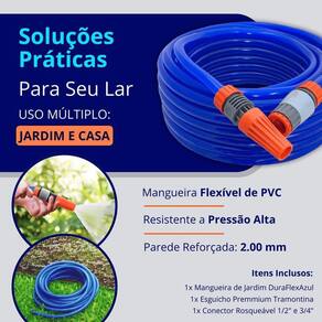Diga adeus às mangueiras comuns que dobram, racham e estouram Nossa linha de mangueiras DuraFlex foi desenvolvida com materiais de alta qualidade, garantindo flexibilidade e facilidade de transporte. Com uma estrutura reforçada, as mangueiras DuraFlex são extremamente resistentes e não dobram, proporcionando uma passagem de água suave e contínua. Você pode confiar na DuraFlex para enfrentar os desafios diários de irrigação e jardinagem. Nossas mangueiras são altamente duráveis e resistentes, garantimos um desempenho consistente ao longo do tempo. Compatíveis com torneiras padrão de 1/2 e 3/4, as mangueiras DuraFlex se adaptam facilmente ao seu sistema de irrigação. Destacamos algumas características e diferenciais impressionantes das mangueiras DuraFlex: - Resistência excepcional: Nossas mangueiras são mais fortes e resistentes do que as mangueiras convencionais, garantindo uma vida útil prolongada; - Flexibilidade sem comprometer a passagem de água: As mangueiras DuraFlex permitem curvas suaves, facilitando o direcionamento da água exatamente onde você precisa; - Leveza e fácil caminhada: Projetadas para serem leves, as mangueiras DuraFlex são fáceis de transportar e usar, proporcionando uma experiência de uso agradável em seu jardim; - Acompanha kit de irrigação premium: Além da mangueira de excelente qualidade, o pacote também acompanha um kit de irrigação premium, já chegando pronta para uso. ESPECIFICAÇÕES: Modelo: DuraFlex; Material: PVC Siliconado de Dupla Camada; Pressão de Trabalho Recomendada: 12 bar 174 psi ; Temperatura de Trabalho Recomendada: 5C a 50C; Medidas Internas: 1/2 x 2,00 mm; Comprimento: 25 Metros; Cor: Azul. A EMBALAGEM ACOMPANHA: 01 - Mangueira de Jardim DuraFlex Azul; 01 - Esguicho Tramontina Premium com Jato Regulável; 01 - Engate Tramontina para Torneiras de 1/2 e 3/4; 01 - Termo de e Instruções de Uso. CUIDADOS E RECOMENDAÇÕES: - Caso a mangueira fique exposta ao sol, não abra o registro com o esguicho fechado, isso pode diminuir a vida útil do produto; - Mangueira recomendada para uso doméstico na jardinagem, agricultura e irrigação em geral; - A temperatura máxima de trabalho recomendada da água é 50 C; - Retire a pressão e a água da mangueira após o uso; - Enrole a mangueira após o uso. OBSERVAÇÕES IMPORTANTES: - A mangueira foi feita sob medida para ser utilizada em trabalhos domésticos e jardinagem, não nos responsabilizamos pelo mal uso do produto; - A mangueira é de dupla camada, com a camada interna na cor preta e a externa na cor Azul; - O produto já chega pronto para uso; - Leia as instruções de uso. Com as mangueiras DuraFlex, você pode ter a confiança de que está adquirindo um produto de melhor qualidade. Nossas mangueiras são fabricadas seguindo todos os padrões de qualidade, garantindo seu desempenho e durabilidade. Imagens meramente ilustrativas. Marca: Não Informado