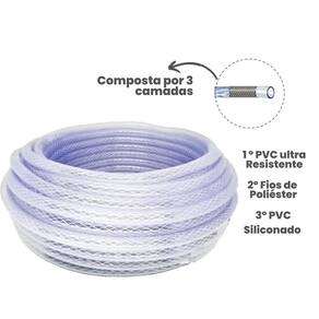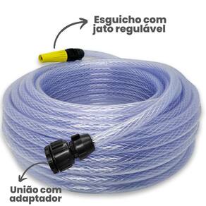 Mangueira de jardim trançada cristal + esguicho + união tamanho:15m Descrição do produto: A mangueira de jardim policorda poliflex trançada cristal já acompanha união conexão com a torneira e um esguicho regulável acoplado. Esse produto é ideal para você que busca por um produto discreto e durável, em primeiro lugar - já que sua dupla camada de pvc é interposta por uma camada de fio de poliéster, o que atribui mais resistência ao produto. Atenção: não se recomenda utilizar esse produto em máquinas de alta pressão