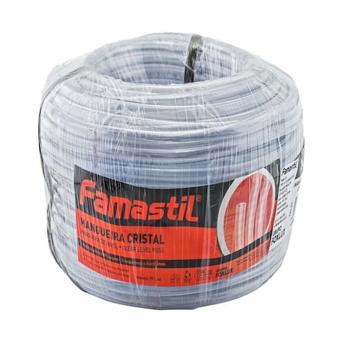 Modo de Usar: Transparência que permite visualizar passagem de fluído Basta unir as duas extremidades do tubo; Encher a mangueira com água, deixando faltar 20 cm para transbordar; Esticar a mangueira com as pontas para cima; Certificar que não tem bolhas de ar; Escolher o primeiro ponto e riscar na parede de acordo com a marca da água; Posicionar a outra ponta da mangueira no local desejado. Quando a água se estabilizar, marcar o novo ponto nivelado. Esse é apenas um exemplo de uso da mangueira cristal, você também pode usá-la na proteção de tubos, cordas e irrigação