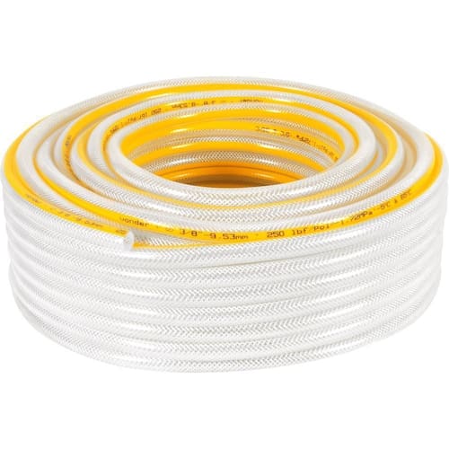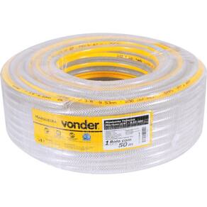 Ref.: do Fornecedor:3332380000Marca:VonderConteúdo da Embalagem:50 metros de mangueira cristal trançadaDestaques e diferenciais:Possui matéria-prima em PVC transparente.Aplicações e dicas de uso:Indicada condução de ar e água. Nunca utilizar para gás GLP.Características Técnicas:Diâmetro interno da mangueira: 3/8 - 9,5 mm Diâmetro externo da mangueira: 15,5 mm Cor da mangueira: Transparente Material da mangueira: PVC Pressão máxima de trabalho da mangueira PSI : 250 lbf/pol - 1,72 MPa. Comprimento da mangueira: 50,0 m Espessura da parede da mangueira: 3,00 mm Marca: Não Informado
