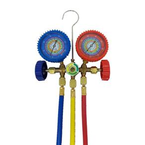 O Manifold Analógico Profissional JCM, ou manômetro, serve para medir a pressão dos fluidos refrigerantes e verificar se eles atingiram a condição de vácuo. Com a ferramenta, é possível aferir a pressão dos principais fluidos refrigerantes: R410A, R22, R407C. Possui a escala BAR e PSI, usadas no Brasil para medir pressão. Permite também aferir a temperatura (em °C). O manifold tem corpo de latão forjado de alta resistência, que garante maior durabilidade mesmo sob uso constante. A vedação dupla O'RING permite o máximo desempenho do produto. O conjunto conta com jogo universal de mangueiras de 90cm.