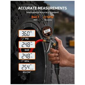 Realize medições precisas de pressão com este resistente manômetro digital com inflador, calibrado manualmente para 1PSI de acordo com o padrão ANSI B40.7 Grau 2A. Comutação livre entre 4 unidades de pressão: PSI, BAR, KPA e KGCM. Compacto e portátil, pesando menos que um smartphone, este manômetro é perfeito para verificações de pressão em movimento. Funcionalidades completas, compatível com acessórios padrão de compressor de ar de 1/4 NPT. Inclui conector antivazamento, mangueira de ar e válvula de desinflação. Versátil, com faixa de pressão de 3250PSI que garante medições precisas para todos os tipos de veículos. Tolerância a temperaturas extremas de -10°C a 50°C, mantendo precisão de 0.1 PSI. Econômico de energia, liga automaticamente com pressão acima de 10PSI e desliga após 20 segundos de inatividade.