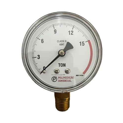 O manômetro com visor de 63 mm e escala de 0 a 15 toneladas é um instrumento utilizado para a medição de pressão em sistemas hidráulicos que operam com altas cargas. Possui construção robusta e é adequado para aplicações industriais que requerem leitura precisa e rápida da pressão exercida em toneladas-força.