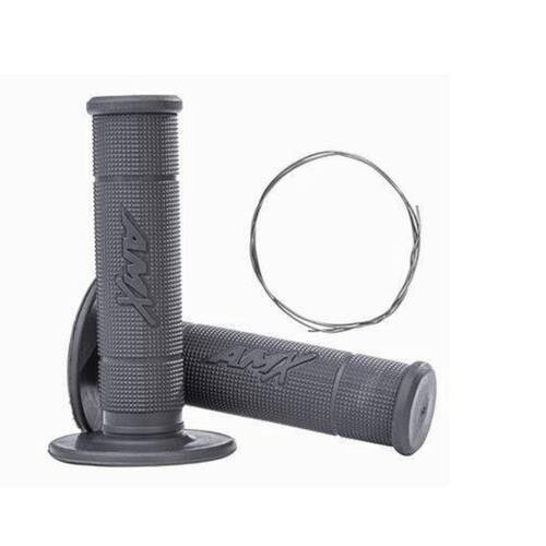 Manopla produzida com material macio de densidade única, textura de micro pirâmides e retângulos em alto relevo para melhor fixação dos dedos, possui canaletas para arame além do acabamento para melhor encaixe dos manetes de freio e embreagem.