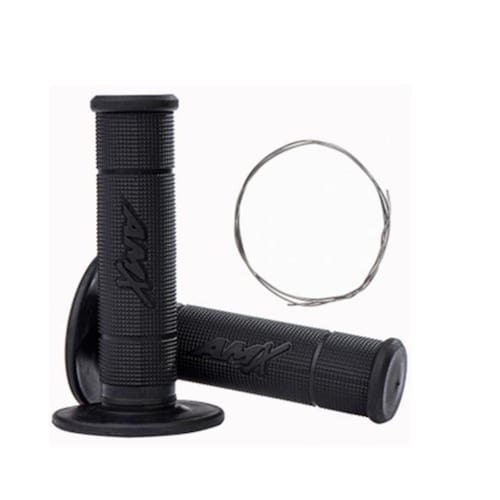 Manopla produzida com material macio de densidade única, textura de micro pirâmides e retângulos em alto relevo para melhor fixação dos dedos, possui canaletas para arame além do acabamento para melhor encaixe dos manetes de freio e embreagem.