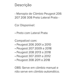 modelo ao peugeot 208 2014 a 2018 fabricada em pvc de alta resistência disponível na cor preto com lateral prata possui indicadores de marcha não compatível com veículos com limitador de ré instalação realizada através de encaixe encaixe sob medida diâmetro aproximado do furo de encaixe: 1,4cm dimensões aproximadas da manopla axlxp : 9,4x5,1x6,5cm