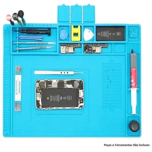 ; ; ; Possui conta divisórias para a organização de peças, podendo ser divididas por tamanhos e tipos como parafusos, porcas, arruelas, plugues, conectores, componentes eletrônicos dentre outros utilizados no dia a dia do trabalho com manutenção de celulares, tablets e equipamentos eletrônicos em geral