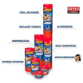 Manta asfáltica adesiva terracota - 30cm x 10m - ideal para solucionar aquele problema chato de vazamento por conta de uma trinca ou mesmo pequenos furos.Descrição:Fita autoadesiva multiuso à base de asfalto protegida com filme na cor terracota que permite sua exposição a intempéries e aos raios solares, para solucionar problemas de gotejamento e vedações.Características:- fácil aplicação- compatível com diversas superfícies- já na cor do seu telhado- alto poder de estanqueidade- a base de asfalto modificado- alta reflexão térmicaFicha técnica:- medidas: 30cm x 10mt- cor: terracota- marca: dryko- composição: asfalto, polímero, filme de alumínio.Onde aplicar:- telhado- rufos e chapas metálicas;- dutos de ventilação e ar condicionado;- sheds e cúpulas,- vedações de domos e claraboia;- reparos rápidos em baús, toldos e similares;- para outras aplicações consulte o time técnico dryko.Aplicação:- aplique uma demão de drykoprimer acqua ou drykoprimer eco e aguarde a secagem por no mínimo 6 horas antes da colagem.- aplicação da drykofita vedatudo terracotaEm telhados inicie a aplicação sempre do ponto mais baixo para o mais alto.Remova o filme plástico expondo o asfalto adesivo e aplique este lado na superfície imprimada pressionando para melhor aderência e removendo possíveis bolhas de ar. A drykofita vedatudo terracota deve estar totalmente apoiada na superfície de aplicação.- em superfícies irregulares como telhados deve aplicar a drykofita vedatudo terracota acompanhando as ondulações, removendo o filme plástico conforme faz a aderência na superfície.- em áreas muito frias promover o pré-aquecimento da drykofita vedatudo terracota com ar quente ou através do calor do solObservações:Condições de aplicação: mínimo 20 c e máximo 50 c.A drykofita vedatudo terracota não é indicada para superfícies que apresentem altas temperaturas.A drykofita vedatudo terracota não tem resistência a chuvas de granizo, não deve ser aplicado em condições de imersão, reparos de tubulações ou de pressão negativa. Não substitui peças complementares em telhados e outros sistemas;Não deve ficar exposta ao tráfego de pessoas ou veículos.O que acompanha:- 01 manta asfáltica adesiva terracota - 30cm x 10m
