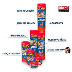 Manta asfáltica adesiva terracota - 30cm x 10m - ideal para solucionar aquele problema chato de vazamento por conta de uma trinca ou mesmo pequenos furos. Descrição: Fita autoadesiva multiuso à base de asfalto protegida com filme na cor terracota que permite sua exposição a intempéries e aos raios solares, para solucionar problemas de gotejamento e vedações. Características: - fácil aplicação - compatível com diversas superfícies - já na cor do seu telhado - alto poder de estanqueidade - a base de asfalto modificado - alta reflexão térmica Ficha técnica: - medidas: 30cm x 10mt - cor: terracota - marca: dryko - composição: asfalto, polímero, filme de alumínio. Onde aplicar: - telhado - rufos e chapas metálicas; - dutos de ventilação e ar condicionado; - sheds e cúpulas, - vedações de domos e claraboia; - reparos rápidos em baús, toldos e similares; - para outras aplicações consulte o time técnico dryko. Aplicação: - aplique uma demão de drykoprimer acqua ou drykoprimer eco e aguarde a secagem por no mínimo 6 horas antes da colagem. - aplicação da drykofita vedatudo terracota Em telhados inicie a aplicação sempre do ponto mais baixo para o mais alto. Remova o filme plástico expondo o asfalto adesivo e aplique este lado na superfície imprimada pressionando para melhor aderência e removendo possíveis bolhas de ar. A drykofita vedatudo terracota deve estar totalmente apoiada na superfície de aplicação. - em superfícies irregulares como telhados deve aplicar a drykofita vedatudo terracota acompanhando as ondulações, removendo o filme plástico conforme faz a aderência na superfície. - em áreas muito frias promover o pré-aquecimento da drykofita vedatudo terracota com ar quente ou através do calor do sol Observações: Condições de aplicação: mínimo 20 c e máximo 50 c. A drykofita vedatudo terracota não é indicada para superfícies que apresentem altas temperaturas. A drykofita vedatudo terracota não tem resistência a chuvas de granizo, não deve ser aplicado em condições de imersão, reparos de tubulações ou negativa. Não substitui peças complementares em telhados e outros sistemas; Não deve ficar exposta ao tráfego de pessoas ou veículos. O que acompanha: - 01 manta asfáltica adesiva terracota - 30cm x 10m Ean: 7898692150546
