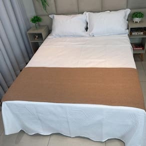 Um novo jeito que criamos é usar ela dobrada como peseira no cama que dá um toque todo especial na cama posta.
