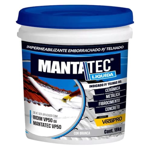 A Manta Líquida Mantatec emborrachada é o melhor custo benefício para impermeabilizar telhados e lajes em conjunto ao tecido estruturante Bidim vp50 ou Mantatec vp50 Produto desenvolvido para impermeabilização e controle térmico de telhados, lajes, paredes e solos in loco . Apresenta resistência à tração e alongamento necessários para resistir à dilação das estruturas, criado para dar estruturação às emulsões em obras de impermeabilização