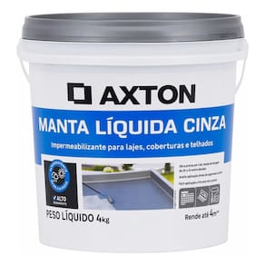 Resumo das caracteristicas e especificacoes: Manta Liquida Impermeabilizante com peso de 4 kg, cor cinza, acabamento liso e tempo de secagem de 4 horas. Rendimento de 1,20 m2 por kg, sendo recomendada a aplicacao de 3 demaos para uma cobertura completa. Produto indicado para uso em lajes, coberturas, areas molhadas, telhas de concreto e fibrocimento. Altura de 19 cm e largura de 18 cm. Produto da marca Axton."