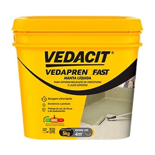 VEDACIT VEDAPREN FAST é uma manta líquida, de base acrílica, secagem ultrarrápida e aplicação a frio sem emendas, pronta para uso e moldada no local. Com alto rendimento, cobre a estrutura com uma proteção impermeável e apresenta ótimas características de elasticidade, flexibilidade e aderência, tendo uma grande durabilidade e alta resistência a intempéries. Proporciona um excelente acabamento, além de refletir os raios solares, o que reduz parte do calor absorvido pela estrutura. VEDACIT VEDAPREN FAST dispensa proteção contra os raios solares.