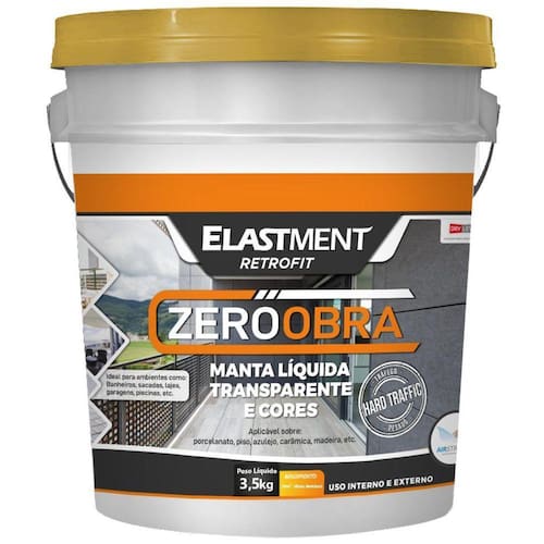 Neste anúncio você compra:- Uma embalagem com 3,5kg do ZERO OBRA Elastment Componente A + B O Zero obra da Drylevis é um verniz de poliuretano bi componente base dágua de alto brilho que confere ao substrato proteção contra raios UV e alta resistência mecânica, garantindo alta durabilidade do piso. Resistente a produtos químicos. Fácil limpeza. Excelente resistência ao risco e abrasão. Baixo VOC, resistência ao intemperismo.Composição: Componente A: Poliacrilato em solução aquosa e aditivos. Componente B: Poliisocianato alifático hidrofílicoCor: Incolor e cores consultar .Indicação: Verniz de acabamento brilhante para pisos de madeira, cimento composto, cerâmica, metal, concreto, azulejo. Uso interno e externoTempo de cura: Pot life 5 horas, de 5 a 6 horas ao toque. Cura total 72 horasLiberação de tráfego: 48 horas, trafego pesado: 72 horas. 25C e 60% URA .Tipo de produto: Não inflamávelEmbalagens: 3,5kg Componente A e BAplicação: Rolo trincha, pincel e pulverizaçãoRendimento: 20m para embalagem de 3,5kg. Deve-se considerar sobre o rendimento: as perdas ocasionadas por irregularidades na superfície, sistema de aplicação, porosidade do substrato e condições ambientais.Validade: 12 meses a partir da data de fabricação.Catálise; 100g do componente A para 18g do componente B.Aparência: LíquidoAcabamento Brilhante