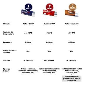 Filme Metalizado+Polietileno+Tecido de Rafia+Polietileno+Filme Metalizado (Não Rasga) Vida útil: de 15 a 20 anos aproximadamente Espessura Aprox.: 0,18mm Redução de temperatura aprox.entre 6°C e 8°C 100% impermeável