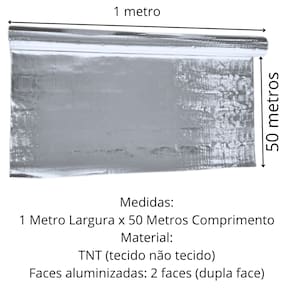 Estrutura: TNT (tecido não tecido) Faces aluminizadas: 2 (dupla face) Espessura: 0,13 mm Largura do rolo: 1 m Comprimento: 50 m Acompanha: 1 fita de emenda aluminizada