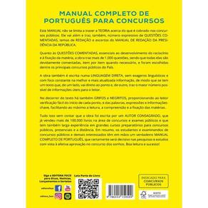 Sobre a obra Manual Completo de Português para Concursos - 4ª Ed - 2024 Este MANUAL não se limita a trazer a TEORIA acerca do que é cobrado nos concursos públicos. Ele vai além e traz, também, número expressivo de QUESTÕES COMENTADAS, temas de REDAÇÃO e excertos do MANUAL DE REDAÇÃO DA PRESIDÊNCIA DA REPÚBLICA. Quanto às QUESTÕES COMENTADAS, essenciais ao desenvolvimento do raciocínio e à fixação da matéria, a obra traz mais de 1.000 questões, sendo que todas elas são devidamente comentadas, item por item quando necessário, e foram escolhidas dentre os principais concursos públicos do País. A obra também é escrita numa LINGUAGEM DIRETA, sem exageros linguísticos e com foco constante na melhor e mais atualizada informação, de modo que se tem um texto que, de um lado, vai direto ao ponto e, de outro, traz o maior número possível de informações úteis para o leitor. No decorrer do texto há também GRIFOS, NEGRITOS e uso de CORES DIFERENCIADAS, proporcionando ao leitor verificação fácil do início de cada ponto, e das palavras, expressões e informações-chave, facilitando ao máximo a leitura, a compreensão e a fixação das matérias. Tudo isso sem contar que a obra foi escrita por um AUTOR CONSAGRADO, que já vendeu mais de 100.000 livros na área de concursos e exames públicos e que tem também larga experiência em grandes cursos preparatórios para concursos públicos, presenciais e a distância. Em resumo, os estudantes e examinandos de concursos públicos e demais interessados têm em mãos um verdadeiro MANUAL COMPLETO DE PORTUGUÊS, que certamente será decisivo nas pesquisas e estudos com vista à efetiva aprovação no concurso dos sonhos. Boa leitura e sucesso!