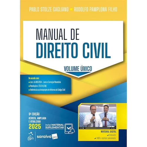 O Manual de direito civil foi revisto, ampliado e atualizado pelos autores, Pablo Stolze Gagliano e Rodolfo Pamplona Filho, para a edição de 2025, reforçando o sucesso da proposta da obra: um manual completo que contempla em apenas um volume todo o conteúdo fundamental de Direito Civil exigido ao longo da graduação em Direito, de forma concisa, prática e atual. Respeitando a ordem estabelecida no Código Civil, o livro inicia-se com a Parte Geral, seguida por Obrigações, Contratos, Responsabilidade Civil, Direitos Reais, Direito de Família e, por fim, Sucessões. O conteúdo da obra foi elaborado com a preocupação de proporcionar ao leitor uma melhor compreensão da matéria, com exemplos didáticos, palavras-chave em destaque na cor cinza, jurisprudência relevante, quadros e esquemas gráficos, que contribuem para a fixação e revisão do seu estudo. A nova edição conta com material digital exclusivo, consistindo em capítulos selecionados que estão disponibilizados de forma on-line, com a possibilidade de download, e em videoaulas complementares ao longo da obra. Tenha neste manual um companheiro e um aliado, que o auxiliará a galgar o que almeja, seja na graduação, na vida profissional ou em concursos públicos. ?