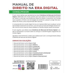 Sobre a obra Manual de Direito na Era Digital: Consumidor - 1ª ED - 2023 É com muito apreço que apresentamos essa Coletânea de Manuais de Direito Digital, elaborada com muito carinho para que todos os Universitários possam ter acesso a uma das mais dinâmicas áreas do Direito e vislumbrar um mundo novo; quando o Direito e as tecnologias se combinam, exigindo dos estudiosos do direito, uma compreensão além das leis. A compreensão do mundo digital tornou-se imprescindível para qualquer jurista que almeje sucesso em sua carreira uma vez que as novas tecnologias vieram mudar a forma como vivemos nosso cotidiano e transformando nossos horizontes. É com orgulho, que dedico essa Coletânea de Manuais de Direito Digital e todos os estudiosos e curiosos sobre os avanços e transformações subjacentes ao Direito Digital. Agradeço enormemente a todos que colaboraram com o enriquecimento dessa Coletânea de Manuais de Direito Digital! Obras da coleção Manual de Direito na Era Digital: Civil Manual de Direito na Era Digital: Médico Manual de Direito na Era Digital: Comercial Manual de Direito na Era Digital: Processual Manual de Direito na Era Digital: Trabalho Manual de Direito na Era Digital: Fiscal Manual de Direito na Era Digital: Administrativo Manual de Direito na Era Digital: Constitucional e Ambiental Manual de Direito na Era Digital: Penal e Internacional