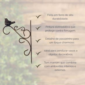 Fabricado em ferro resistente com pintura marrom, o suporte oferece durabilidade e combina facilmente com áreas externas e internas.