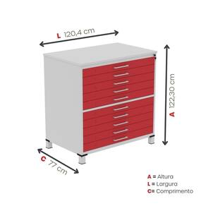 Possui 10 gavetas amplas com corrediças que facilitam a abertura, mesmo com carga total.