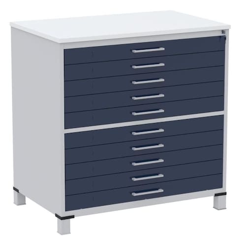 Mapoteca 10 Gavetas Pandin 120 Cm (larg) Inmetro Tampo Mdp Branco Estrutura Aço Cinza Gavetas Azul