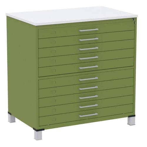 Mapoteca 10 Gavetas Pandin 120 cm (Larg) Inmetro Tampo MDP Branco Estrutura e Gavetas em Aço Verde - Cinza