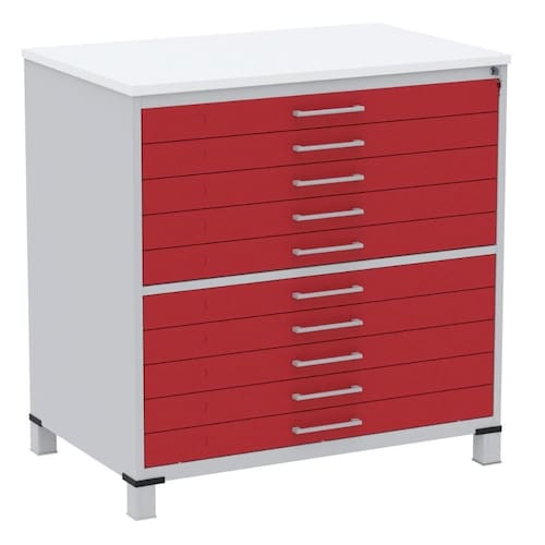 Fabricada com chapa de aço resistente, a mapoteca de aço galvanizado foi desenvolvida com um processo de tratamento anticorrosivo de nanotecnologia e pintada com tinta híbrida eletrostática para maior durabilidade. Com chapas mistas de aço #22 (0,75mm), #24 (0,60mm) e tampo em MDP de 25mm, garante robustez e eficiência perfeitas para espaços de trabalho que necessitam de armazenamento especializado.