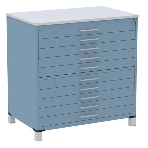 Mapoteca 10 Gavetas Pandin 120cm (Larg) Inmetro Tampo MDP Cinza Estrutura e Gavetas em Aço Azul Dali